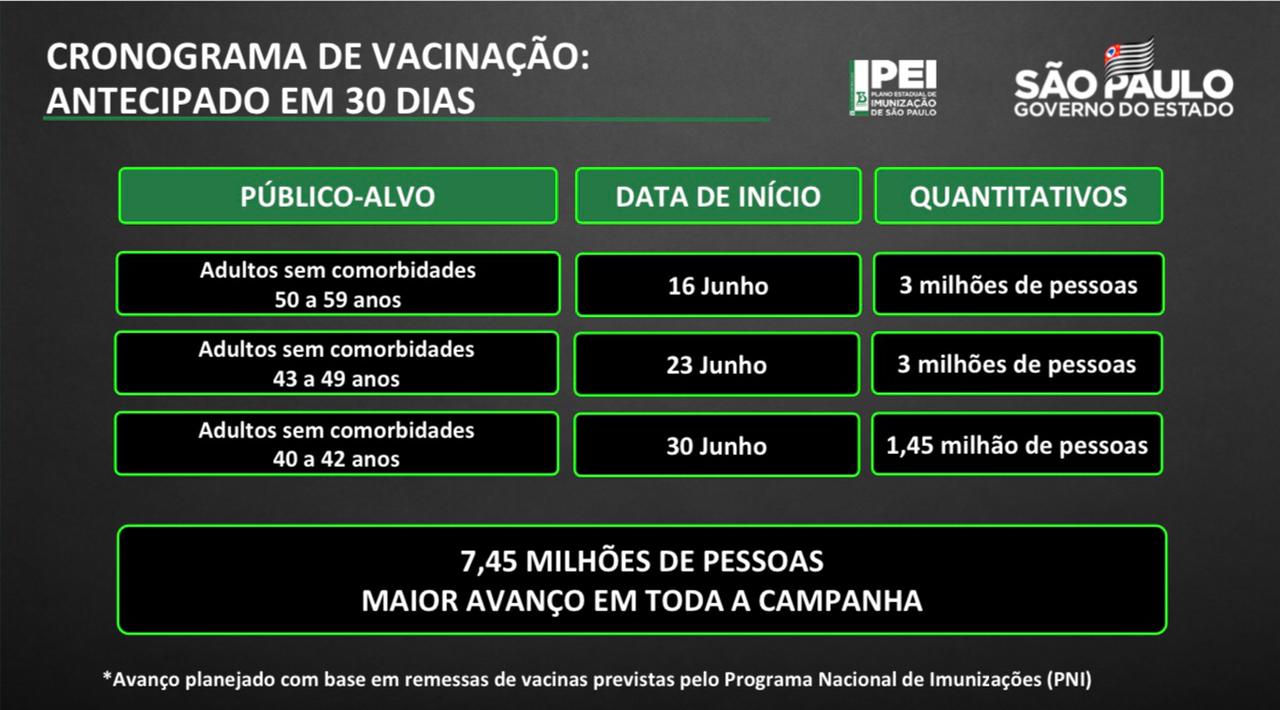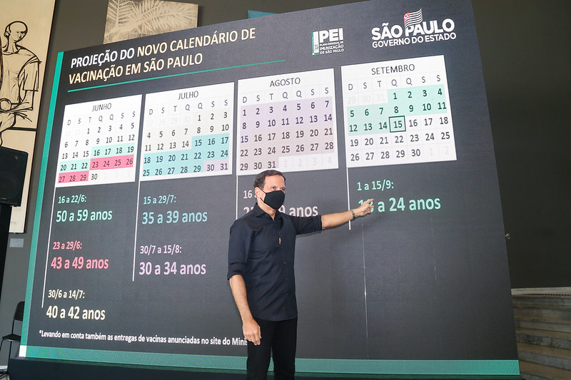 O Governador João Doria anunciou neste domingo (13) que toda a população adulta dos 645 municípios de São Paulo deverá estar vacinada contra a COVID-19 até 15 de setembro, antecipando em 33 dias a estimativa de conclusão do cronograma anterior. Com o novo calendário, pessoas com idade a partir de 40 anos poderão se vacinar contra o coronavírus ainda neste mês.