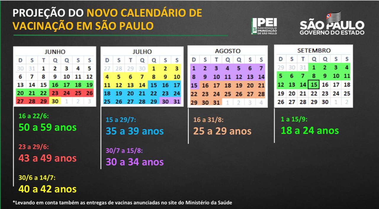A partir do dia 23 de junho, São Paulo vai vacinar a população com idade entre 43 e 49 anos. No dia 30 de junho última quarta-feira deste mês, começa a imunização dos que têm entre 40 a 42 anos.