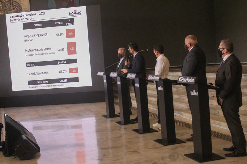 Entre 2019 e 2022, o Governo de SP concedeu reajuste de 26% para policiais militares e civis, 20% para profissionais da saúde e 10% para as demais categorias, enquanto esses percentuais foram, de 2015 a 2018, de 4% para PMs, de 7,7% para policiais civis e de 3,5% para profissionais da saúde e demais categorias.