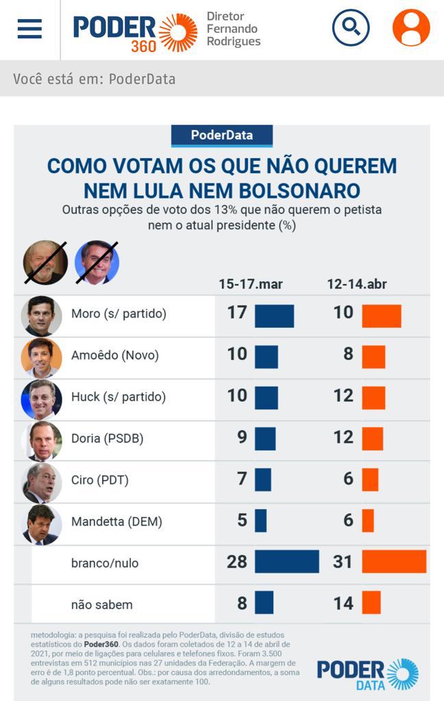 Os demais citados caíram no último levantamento se comparado ao realizado em março. Na dianteira da primeira pesquisa, o ex-juiz Sérgio Moro passou de 17% para 10% no atual. João Amoedo, segundo colocado na pesquisa anterior, saiu de 10% para 8%. Outro a cair na pesquisa foi Ciro Gomes, que caiu de 7% para 6%.