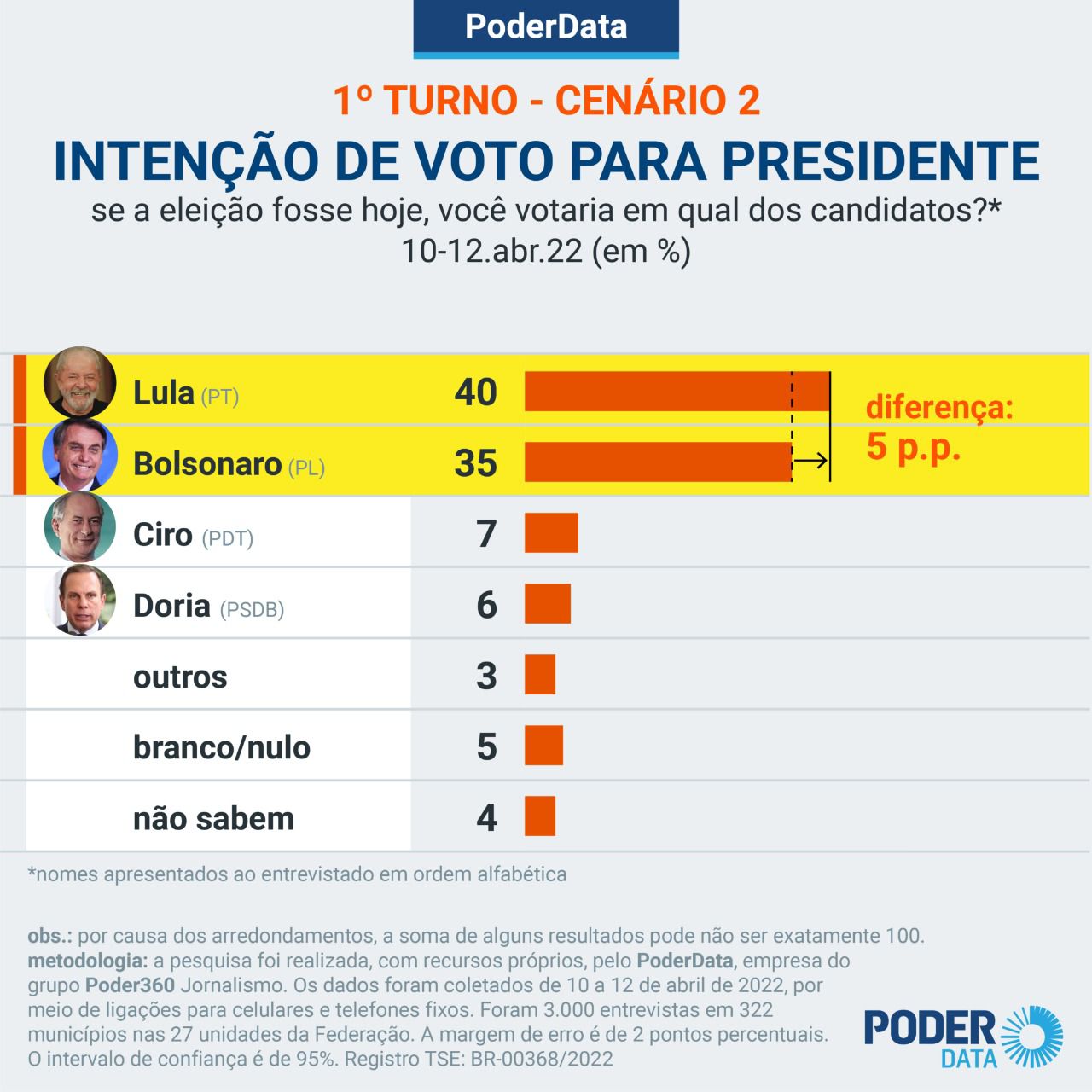 Os dados foram coletados de 10 a 12 de abril de 2022, por meio de ligações para celulares e telefones fixos. Foram 3.000 entrevistas em 322 municípios nas 27 unidades da Federação. A margem de erro é de 2 pontos percentuais. O intervalo de confiança é de 95%. Confira a AQUI