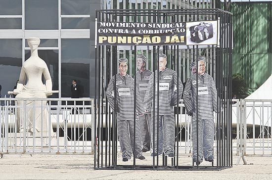 O grupo, vestido com camisetas listradas em preto e branco, guardava uma cela onde estavam presos bonecos de papelão identificados como cinco dos 38 réus do mensalão: o ex-ministro José Dirceu, o ex-deputado João Paulo Cunha, o ex-tesoureiro do PT, Delúbio Soares e os publicitários Duda Mendonça e Marcos Valério – que é acusado de ser o operador do esquema.